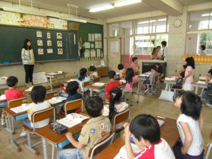 最後は1年生。国語の教科書の挿絵を見て,女の子の気持ちを想像しました。