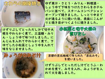 さわらの幽庵焼きは、ゆず果汁・さとう・みりん・料理酒・しょうゆで下味をつけたさわらをスチームコンベクションオーブンで焼いています。身はしっとりと、皮目にこんがり焼き色がつくように、モードや温度などを途中で変えて焼いています。ゆずの香りやさっぱりとした酸味が効いています。暑い時期にさっぱり食べられます。ごはんにもよく合い、子どもたちにも人気でした。