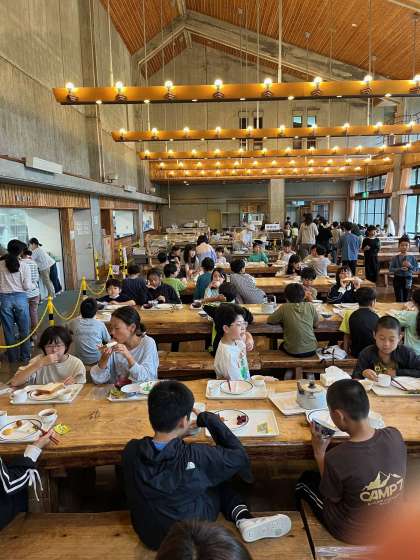 朝の集いが終わり、朝食を食べています。食堂での食事はこれが最後になります。