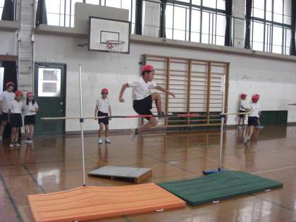 体育の「高跳び」の学習の様子です。それぞれの高さを設定して、高跳びにチャレンジしています。足を高く上げて、バーを跳び越そうと、みんな頑張っています。