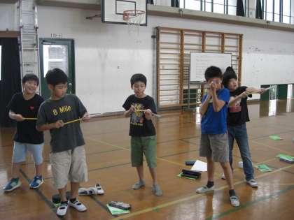 理科の「とじこめた空気や水」の学習の様子です。空気鉄砲を使って、空気を圧したときの手ごたえを確かめました。「ゆっくり圧すと、手ごたえが分かりやすい!」ということに気付き、みんなで手ごたえを確かめることができました。
