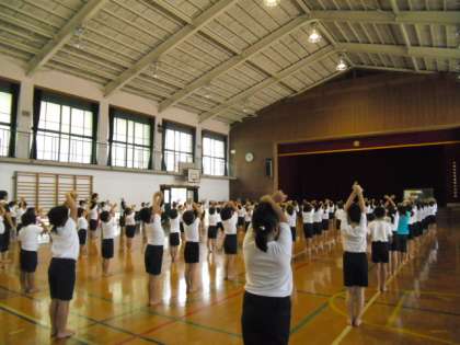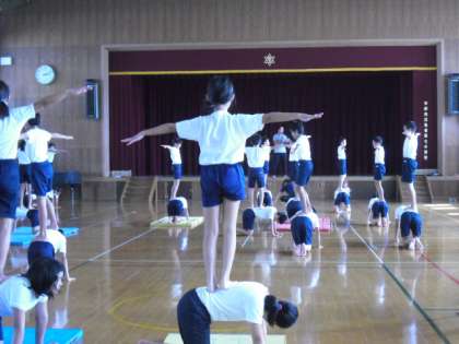 今年の団体演技は,低学年が「よさこい鳴子おどり」,中学年が「キッズソーラン」,高学年が「組体操」です。