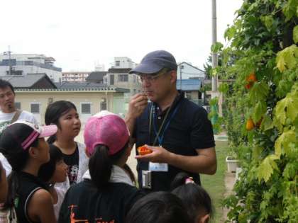 1つ目の活動は,ゴーヤの種採りです。その前に・・・ゴーヤのトンネルをみんなでくぐりました。