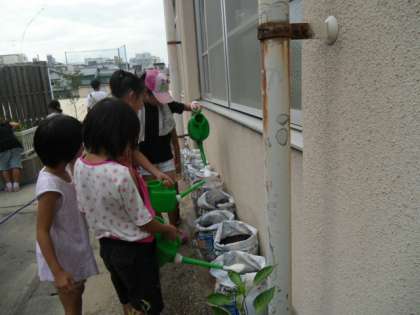 春にインゲン豆を育てた土の袋で,今度は大根を育てます。肥料を混ぜてやわらかくほぐした土に大根の種を3粒ずつ。みんな小さな種をそっと穴に入れ,やさしく土をかけました。秋には,立派な大根に育つといいね。