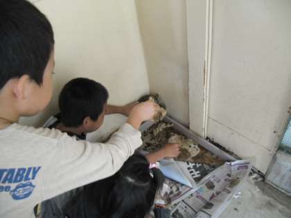 今日も,やっぱり食べてくれません。怖がって小屋の隅っこでうずくまっています。1年生がかわるがわる,そっとさわりました。チョコにはちょっと迷惑なことですが,1年生にはうれしい体験でした。