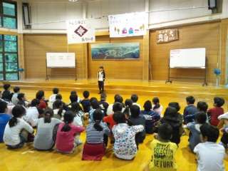 今朝は,一緒に来ている西院小学校と合同です。互いに自分達の学校のことを紹介し合いました。