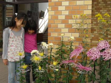 5月のはじめに挿し芽をした菊が,花を咲かせ始めたので,玄関に並べました。さっそく3年生の女の子が見に来てくれました。これから満開になるまで,しばらく玄関で私たちの目を楽しませてくれます。