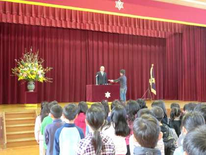 5年生が代表して,校長先生から修了証書を受け取りました。全校の子どもたちが見守る中,とても立派に受け取りました。1番はしに並んでいた6年生がいないのは,なんかぽっかり穴が開いた感じでさびしいのですが,最高学年となった5年生がその穴をしっかり埋めてくれました。