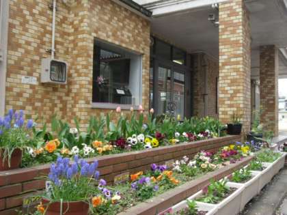 昨日の雨と風で,正門横の桜はすっかり散ってしまいました。でも玄関前の花壇の花たちがみんなを明るく迎えてくれます。