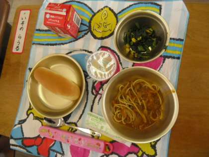 今日は初めての給食です。メニューは,スパゲティミートソース,ほうれん草のソティ,小型コッペパン,牛乳,りんごゼリーです。