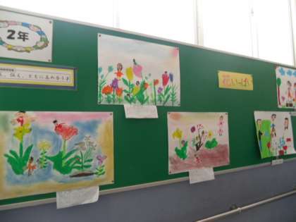2年生は,「花いっぱい」,3年生は,「大好き 自分の線と色」です。どちらも春らしく明るい色使いです。