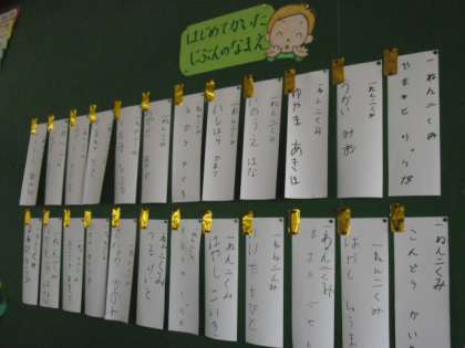 1年生は,初めて書いた自分の名前です。1年後はどのくらい上手になっているでしょう。