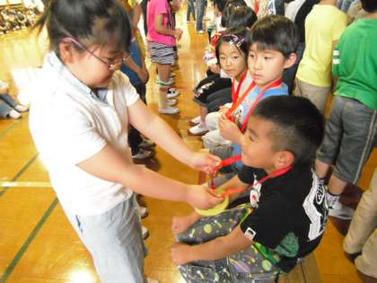 6年生に手をひかれて入場してきた1年生。大きな声で自分の名前が言えました。学校クイズや各学年の出し物を楽しんだり,メダルのプレゼントをもらったりしました。