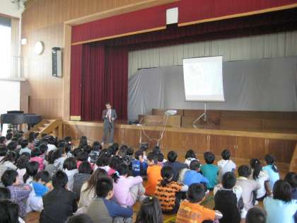 校長先生は,舞台上のスクリーンに大きな写真を映し出し,それを見せながら学校の中の自然についてお話をされました。