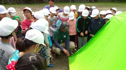 山の家の先生に,テントの建て方を教えてもらいました。ちょっと複雑です。みんな真剣に聞いています。