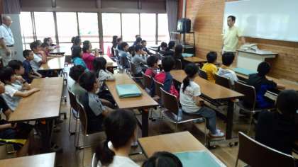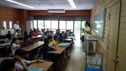 まず,山の家の先生の説明をしっかり聞いています。