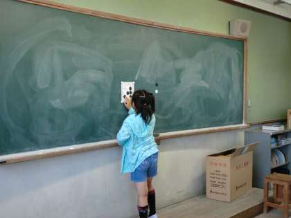 囲碁はルールを習得するまでが大変です。現在,一つの基本である「石をとる」ことをマスターするために,五路盤で『石とりゲーム』をしています。黒番が圧倒的に有利なため,同じ対戦相手と2局ずつ打ち,黒番と白番を1回ずつ交代しながら試合します。徐々にわかってきたようで,先生相手に黒番で勝てる子どももありました。