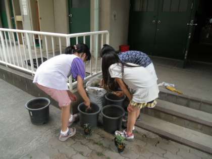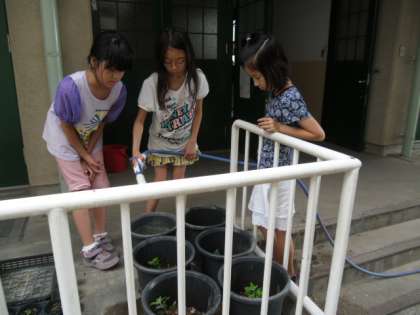5月のはじめに挿し芽をしてから1か月余り,そろそろ鉢上げをしようと,準備をしているところに6年生の女の子が3人。