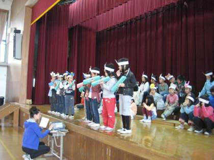 初めて動物のお面をつけた子どもたち,ひな壇に並ぶとかわいい動物の森の出現です。