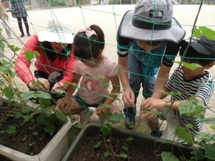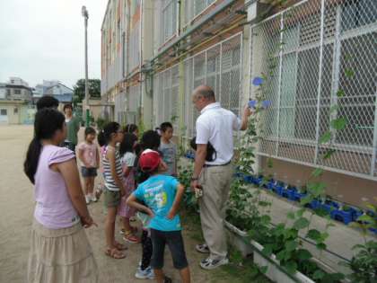 でも,その前に,緑のカーテンの様子の観察です。1年生の教室前のオーシャンブルーが随分伸びてきて,花が咲き始めたものもあります。つるが上手くネットに絡むように,ビニタイで留めていきました。