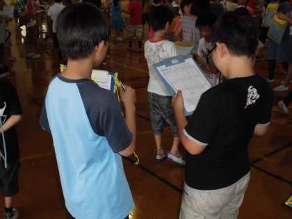 今年度第1回目の児童集会は,「元気ワクワクニコニコ集会」です。全校のみんなが楽しくて笑顔いっぱいの集会になってほしいという願いで名付けられました。集会では,「ドレミの歌」と「サインゲーム」をしました。「ドレミの歌」は,学年ごとにド・レ・ミ・ファ・ソ・ラを担当し,自分のパートになったら立って歌うというものです。学年が足りないシは教職員で,高音のド・レは全員で歌いました。全校で1つの歌を作り上げると,一体感が生まれたように感じました。「サインゲーム」は,9個の質問を他学年の人に質問し,その質問に合っていればサインがもらえるというゲームです。9個全てのマスにサインがはいっている人も多くいたようです。