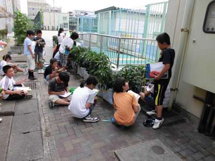 5年生が育てている稲やピーマンですが,最近の暑さにも負けずにぐんぐんと生長しています。先日発芽した種もみはすでに15cmほどになり,そろそろ田植えをするくらいになっています。この苗は,バケツで育てたいと思っています。また,学校の田んぼに植えた苗は20cmを越え,空に向かってまっすぐに伸びています。そして,ピーマンは,太陽の光をいっぱい浴びて生長し,大きな実をたくさんつけるようになっています。子どもたちは暑い中,生長の様子を観察し,記録に残しました。