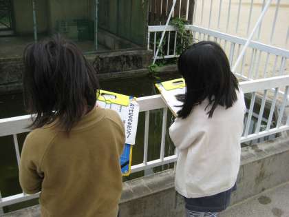 お家の人に知らせたいものを見つけるため,取材に出かけた子どもたち。