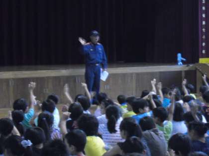 今回は理科室から出火したという想定で,体育館に避難しました。ハンカチで口をおさえ,静かに避難することができました。
