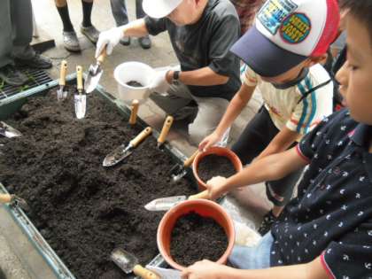 吉彌さんから土の活性化についてお話を聞いた後,その土や肥料を使って,一人一鉢,花の苗を植えました。安心安全の有機肥料で,きっときれいな花をいっぱい咲かせてくれることと思います。