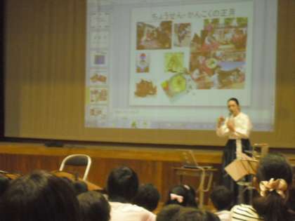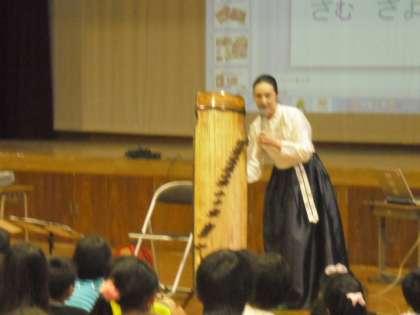 今回は,凌風小学校民族学級担任の金慶子(キムキョンジャ)先生をお迎えし,民族学級について紹介していただいた後,先生が所属しておられる音楽グループMMMの皆さんによる演奏を鑑賞しました。