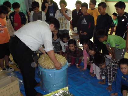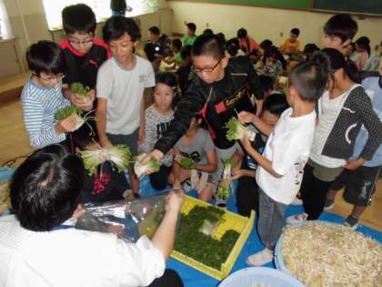 16日(水)の5・6校時,もやしやかいわれ大根を生産されている「サラダコスモ」という会社の方が出前授業をしてくださいました。もやしを暗室で栽培していることや,大きな栽培箱で1度に1トンものもやしを育てていること,かいわれ大根は大根の種を水耕栽培して作られていることなど,今まで知らなかったことをいろいろ教えていただきました。実際に栽培したものを持ってきていただき,もやしを触ったり,においをかいでみたりすることができました。