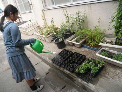 10月5日にまいたキャベツの種が芽を出しました。みどりクラブの6年生が水やりをしてくれています。こんなにかわいい芽がどのくらい大きなキャベツになるのか・・・想像できませんが,楽しみです。