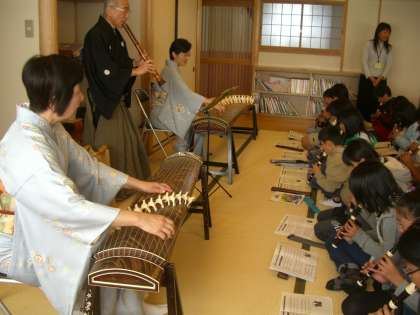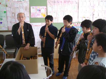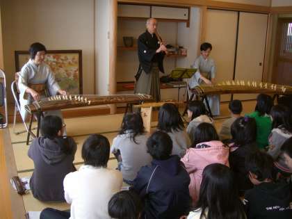 6年生が,日本に古くから伝わる和楽器を体験して,その良さを味わおうと,「和楽器体験教室」をしました。尺八の体験では,なかなか音を出すことができず,「頭がくらくらする。」と言っている子もいました。今まで琴や尺八や三味線を,見たり聞いたりしたことはあっても,実際楽器に触れて感じ,間近にその音色を聴いて感じることは,ほとんどなかったと思います。それで体験する時も意欲的に,聴く時も音色に集中していたのでしょう。時間があっという間に過ぎていきました。日本の文化に触れるひとときでした。