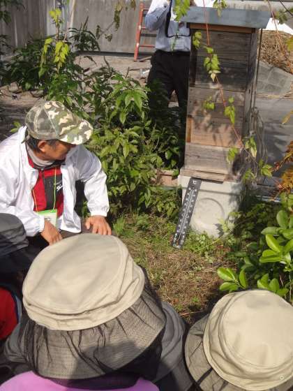 保護者の方もお誘いして一緒に見学をしました。初めて見る屋上庭園や巣箱,初めて知るミツバチの生態などに,大人も子どもも目を丸くしていました。