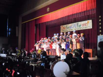プログラム12番は,合奏・合唱「One for all, all for one」5年生です。
