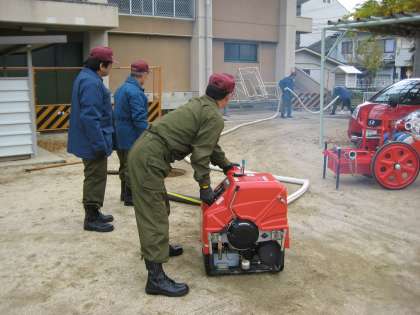 運動場の南側にある消防分団の倉庫から,小型動力ポンプを出して,防火水槽にホースを入れ,放水できるか点検されていました。