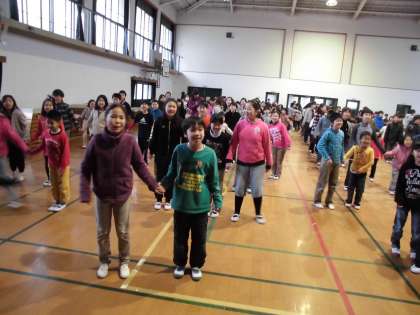 10日(月)の1時間目に体育館で今年度3回目の児童集会を行いました。集会名は,「最後にHOTでもっと仲を深めよう集会」でした。この日も朝の冷え込みが厳しく,体育館の仲も冷え切っていましたが,2つのゲーム「ペアしりとりリレー」と「言うこと一緒 やること逆」を朱七アイビー活動のペアの人と一緒に楽しみました。体を動かしているうちに,体だけでなく,心も温まるような活動ができました。