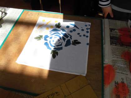 白いハンカチに,型を使い色模様を付け,子ども達は世界で一枚しかない自分だけの友禅染のハンカチを作成しました。