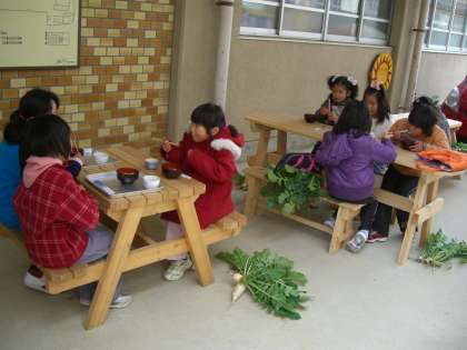 最後は,みんなで収穫した大根の入った豚汁をいただきました。寒い体もポッカポカ。子どもたちは,収穫した大根をお土産に,にこにこ顔で帰りました。