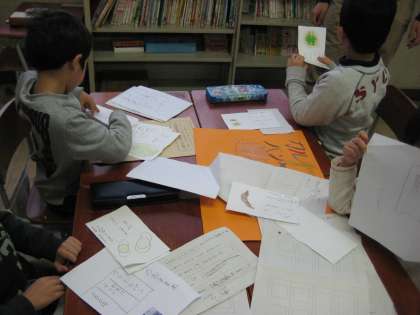 グループごとにお店を決めて,まず,カードに絵と名前を書いて商品作りをしました。
