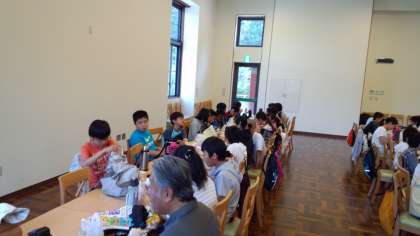 みんなでお弁当タイムです。前日までの雨で予定していた石のエリアでは食べられませんでしたが、館内の部屋をお借りして食べました。この後、石のエリアを見学してから、淡路島へ出発です!