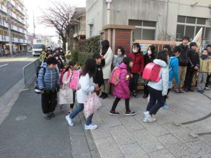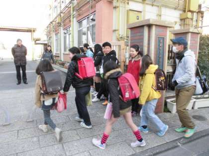 この日は,新しい町班長,副班長の体制になって初めての集団登校でした。新しい町班長が列の先頭で恥ずかしがりながらもあいさつしていました。そして,今まで集団登校を引っ張ってきた6年生は列の一番後ろで登校の様子を見守っていました。