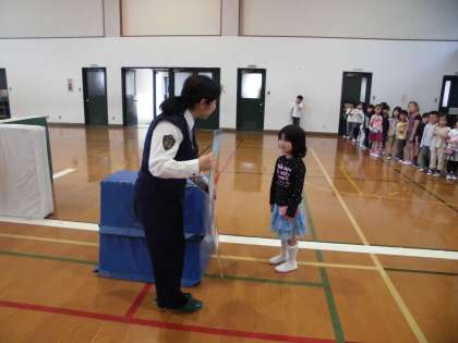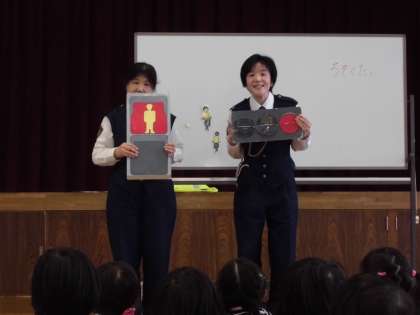中京警察署の方に道路を渡る時には,車が来ていないかをしっかり左右を見て確認することの大切さを教えていただきました。交通安全に気をつけて,これからも登下校してほしいと思います。