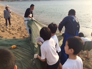 宿舎に着いてすぐに着替えをして,みんながとても楽しみにしていた地引網体験です。普段,なかなか見ることのない海に,みんな大喜び!晩ご飯のおかずのために,全員で協力して網を引くと,たくさんの魚がとれました。