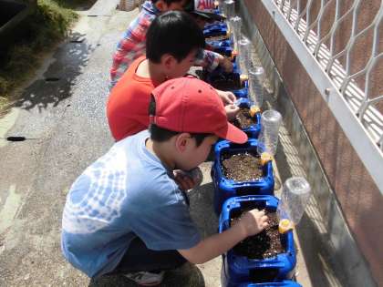 5時間目の生活の時間にアサガオのたねを植えました。