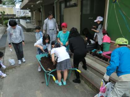 土曜学習の後,みどりクラブの第1回目の活動を行いました。今回は,みどりのカーテンを植える準備としてプランターに土を入れることと,ビニールポットに土を入れてマリーゴールドやコスモスなどの花の種をまくことをしました。毎年,地域の方にもお世話になっていて,今回も3名の方に協力していただきました。みんなで協力して,緑いっぱいの朱七校にしていきたいと思います。みどりクラブの次回の活動も,土曜学習と同じ6月13日を予定しています。