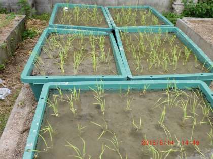 みんなで田んぼ代わりのトレ—に土を入れて運んで水をはり,そこに一人ずつ苗を植えていきました。どろどろになりながらも,みんな楽しんでいました。これからぐんぐん伸びておいしいお米になるように,がんばって育てていきたいと思います。