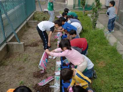 なれない手つきで土をいれ、肥料をいれて、種をまいて・・