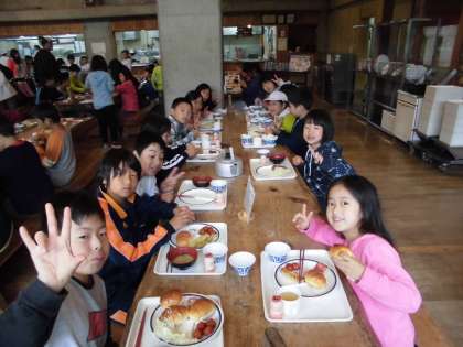 今日の朝食は,子どもたちが好きなミートボールやゆでたまごなどでした。パンもよく食べられていました。