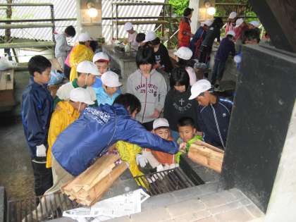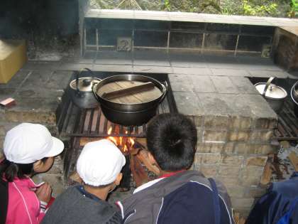 ここからは,本格的な野外炊飯。係に分かれ,それぞれの役割を責任もって果たさなければ,おいしい昼食が食べられません。かまどで火をおこす子,ご飯を炊く子,豚汁を作る子・・・初めての経験で,分からないことやうまくいかないことだらけでしたが,何とか出来上がりました。自分達で力を合わせて作った昼食の味は格別です。どの班も「おいしい!」を連発しながら,完食でした。食べた後は後片付けです。なべについたすすや,こびりついた米つぶを洗い落とすのは一苦労。全部の班が先生から合格をもらったのは3時を過ぎていました。